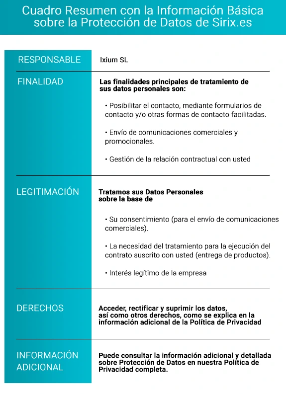 Adicionalmente, aquí facilitamos una tabla resumen simplificada y resumida para que definitivamente no le quede ninguna duda de nuestra Política de Privacidad :
